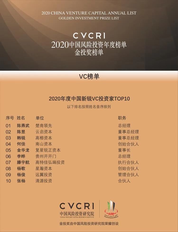 (图三为“2020年度中国新锐VC投资家TOP10”榜单)