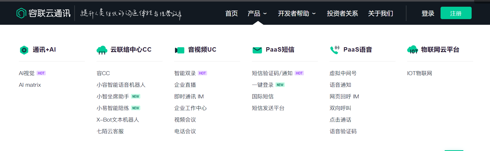 容联是一家企业通讯云服务提供商,以云计算的方式,为企业客户提供通讯平台服务PaaS和通讯软件服务SaaS。其主营业务有PaaS通讯能力(语音、短信等)、CC(云客服与云联络中心)、UC(IM即时通讯云平台、视频与会议)、行业新通讯解决方案和“AI+通讯”服务五大板块。