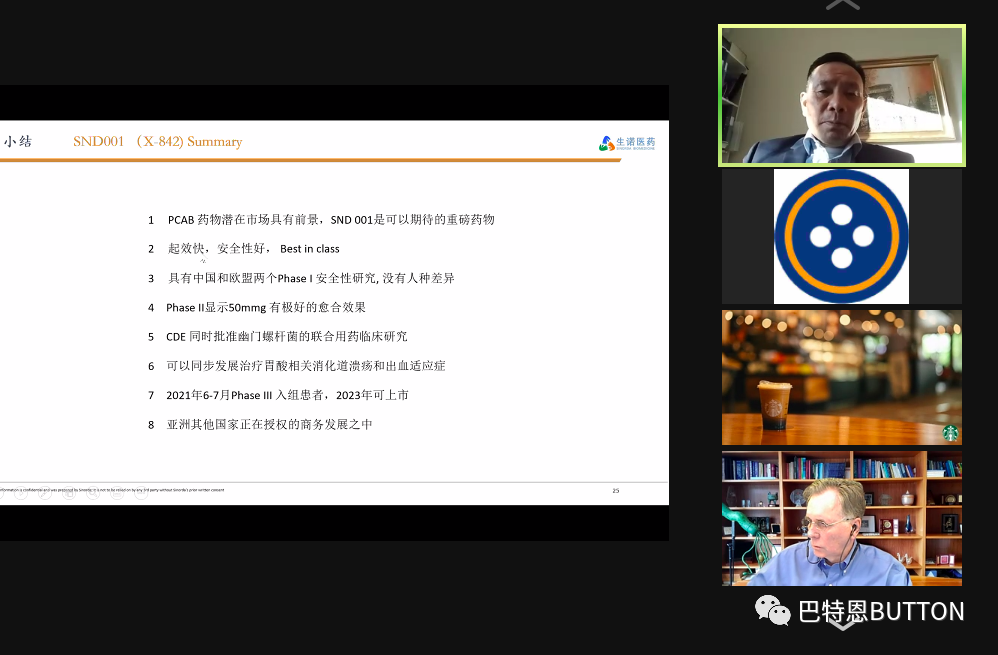 (图二为HU博士介绍生诺生物药物情况) 活动由美国BUTTON公司总经理刘舒天主持,2005年诺贝尔奖得主、中国科学院外籍院士、西澳大学临床微生物学教授BARRY MARSHALL博士、生诺生物创始人兼董事长PINGSHENG HU博士、海通证券投行银行部业务董事张子慧先生作为嘉宾出席了此次活动。 同时,苏州生物医药转化工程中心、华氏医药、上海医药、北大医学、药时代、中君亚泰、亚宝投资、前海投资、华润、上海群智通、陆家嘴信托、东方嘉富、浙商证券、安银资本、深圳蓝马资本、维思资本、共和投资、黑盛投资等近30家投资机构和相关领域的合作伙伴参加了此次活动。 问答环节中,HU博士详细分析了公司I类新药X842未来的销售预计情况,并表示相比于其他药企的同类型药物,X842更加安全、更加有效。 在最后的专家访谈环节中,HU博士介绍了胃肠道疾病领域的几个主要药企及其重点药物,并根据X842在国内二期临床数据的优异表现,分析了该药物对比其他药企同类型创新药在安全性、有效性方面的明显优势。 MARSHALL博士介绍了胃肠道疾病领域的学术方面的最新动态,高度肯定了X842治疗幽门螺旋杆菌感染的前景,并计划针对X842治疗幽门螺旋杆菌感染进行大规模科研临床试验,以帮助X842一步步推向市场。 张子慧分享了海通帮助众多制药公司上市的案例,并根据该瑞典创新药项目的战略和计划,指出生诺生物已经具备了申报上市的条件。